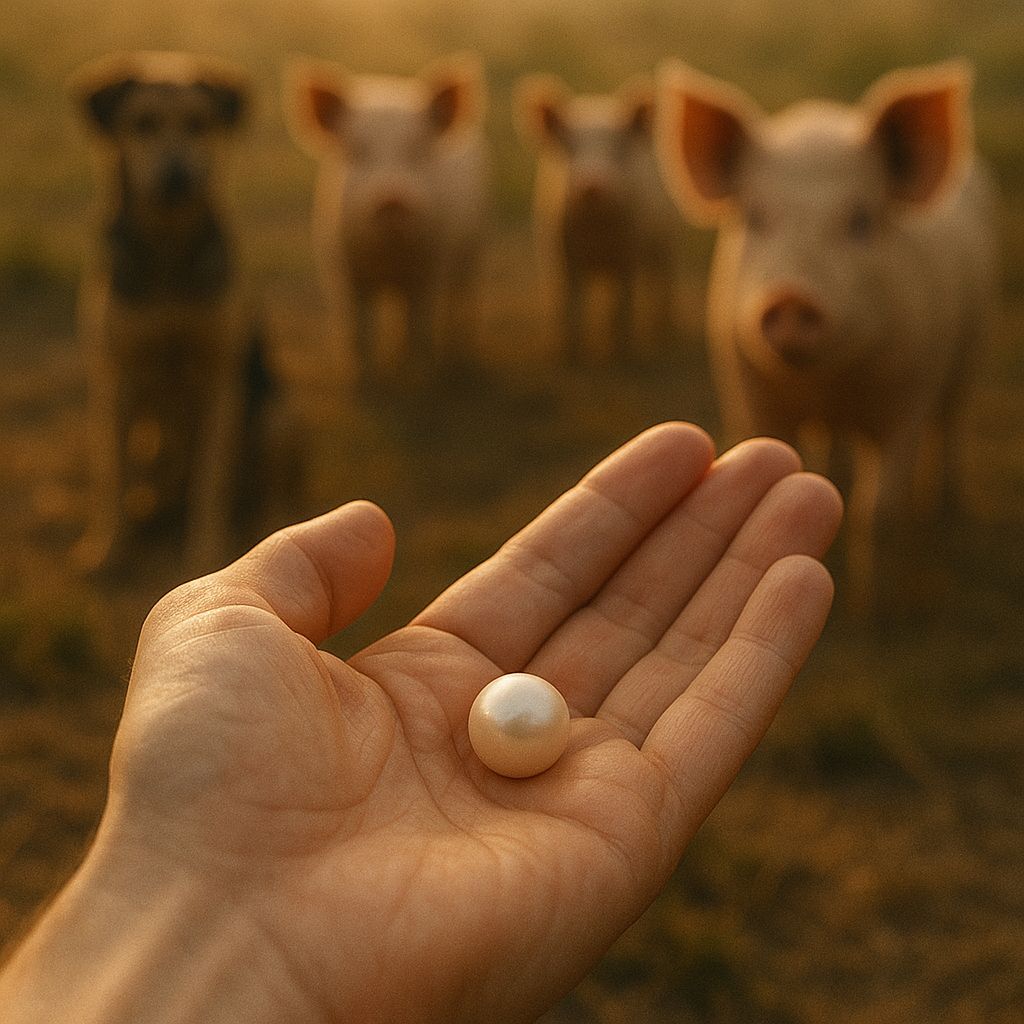 In jedem Menschen gibt es innere Schätze - tiefe Einsichten, seelische Erfahrungen, zarte Wahrheiten, die oft in Momenten der Stille, des Leidens oder des Gebets gewachsen sind. Diese 'Perlen' sind keine äußeren Besitztümer, sondern innere Wahrheiten, die unsere Identität, unsere Würde und unsere Berufung berühren. Tiefenpsychologisch kann man hier von Selbstanteilen sprechen, die besonders verletzlich sind: das kindliche Vertrauen, die ureigene Spiritualität, das schöpferische Potenzial, die innere Stimme. Solche inneren Perlen sind empfindlich wie ein frisch gewachsenes Pflänzchen: Sie brauchen Schutz, Erdung und einen fruchtbaren Boden - nicht lautes Getöse, Zynismus oder Missachtung.