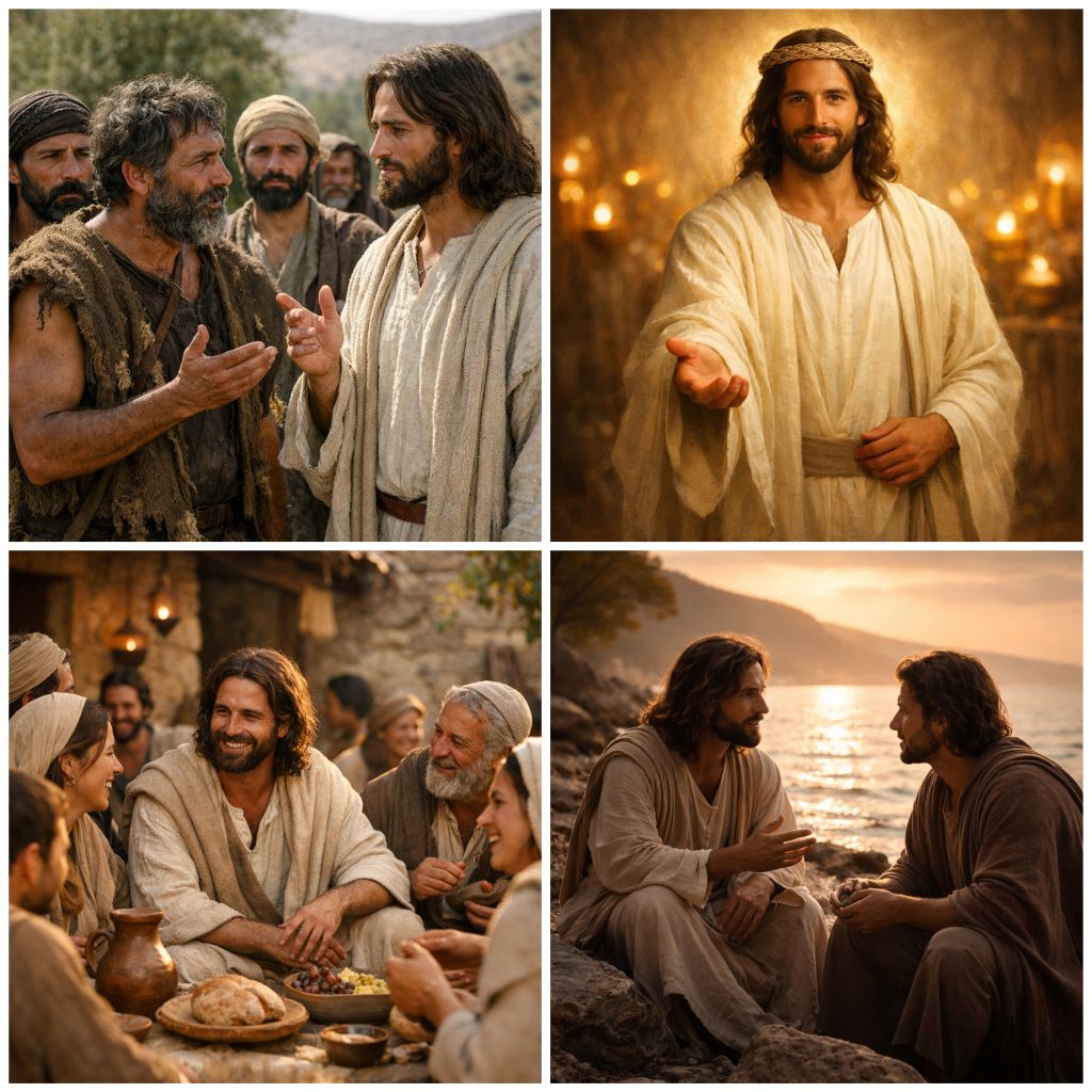 Jesus schweigt einen Moment. Er blickt über den See, wo das Licht des späten Nachmittags auf dem Wasser tanzt.