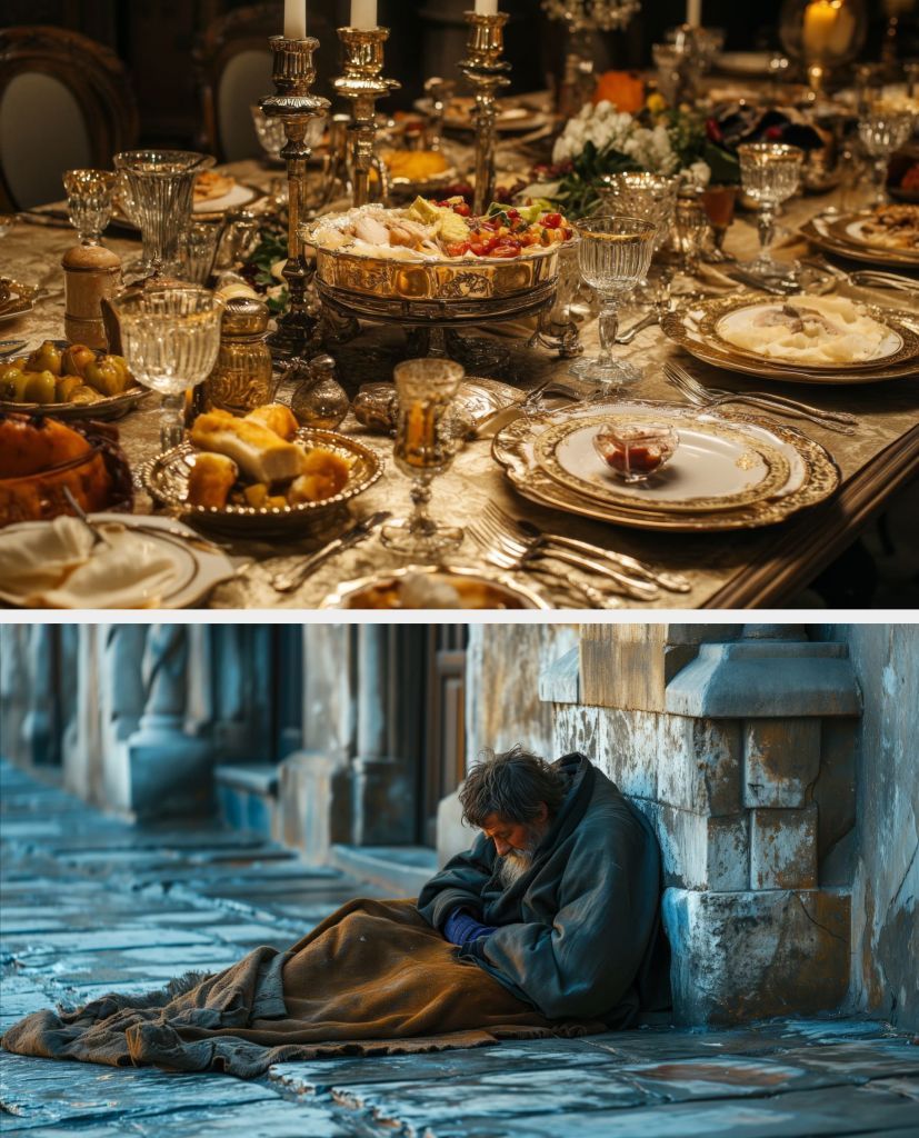 Oben auf dem Bild: ein Tisch, schwer gedeckt mit Gold, Kristall und Überfluss. Ein Raum voller Glanz und Sicherheit. Unten: ein Mensch auf dem kalten Boden, in eine Decke gehüllt, hungrig, erschöpft, übersehen. Zwei Welten, die nicht zusammenzupassen scheinen.