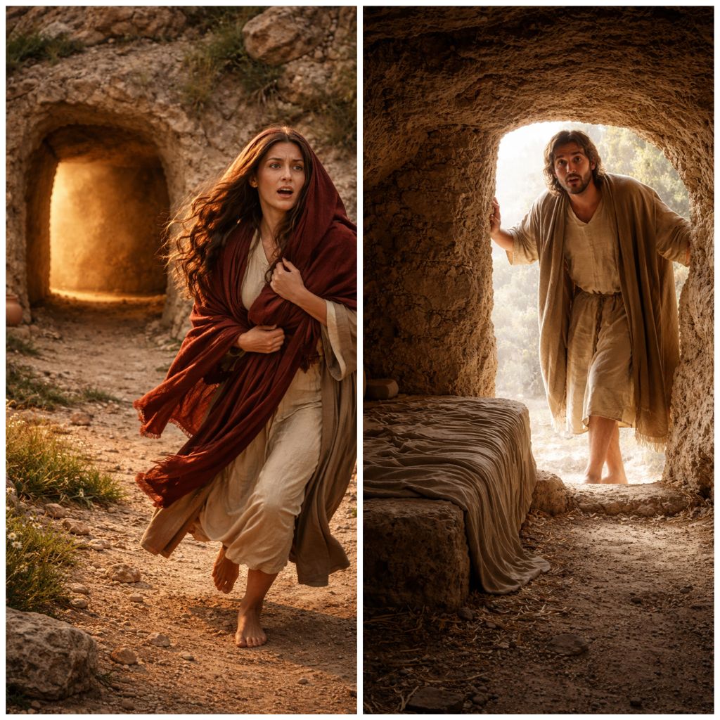 Maria aus Magdala brachte Petrus und dem anderen Jünger die Nachricht, man habe den Herrn aus dem Grab weggenommen, und sie wisse nicht, wohin man ihn gelegt hat. Beide eilten daraufhin gemeinsam zum Grab Jesu. Der andere Jünger war schneller als Petrus und kam als erster zur Grabkammer. Er ging noch nicht hinein, sah aber von außen durch den geöffneten Eingang die Leinenbinden, in die der Leichnam Jesu eingewickelt war. Er wartete auf Petrus und ließ ihm den Vortritt. Nach Petrus ging auch der andere Jünger ins Grab. Er sah die leere Grabkammer und die Leinenbinden und kam dadurch zum Glauben an die Auferstehung Jesu. Da ist keine Erwähnung von Himmelsboten.