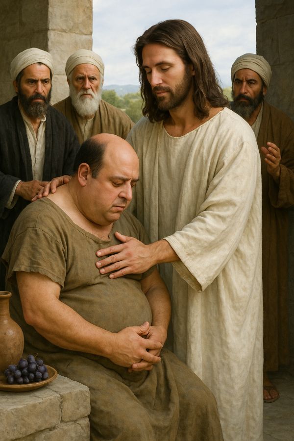 Mitten in diese gespannte Szenerie tritt ein Mann. Der Text sagt schlicht: 'Und siehe, vor ihm stand ein Mann, der an Wassersucht litt.'