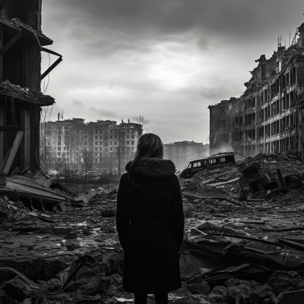 Das Bild zeigt eine Frau, die mit dem Rücken zum Betrachter des Bildes steht und auf die Ruinen einer zerstörten Stadt blickt. Aus tiefenpsychologischer Sicht ist dieses Szenario kein äußeres Kriegsbild, sondern ein innerer seelischer Zustand.