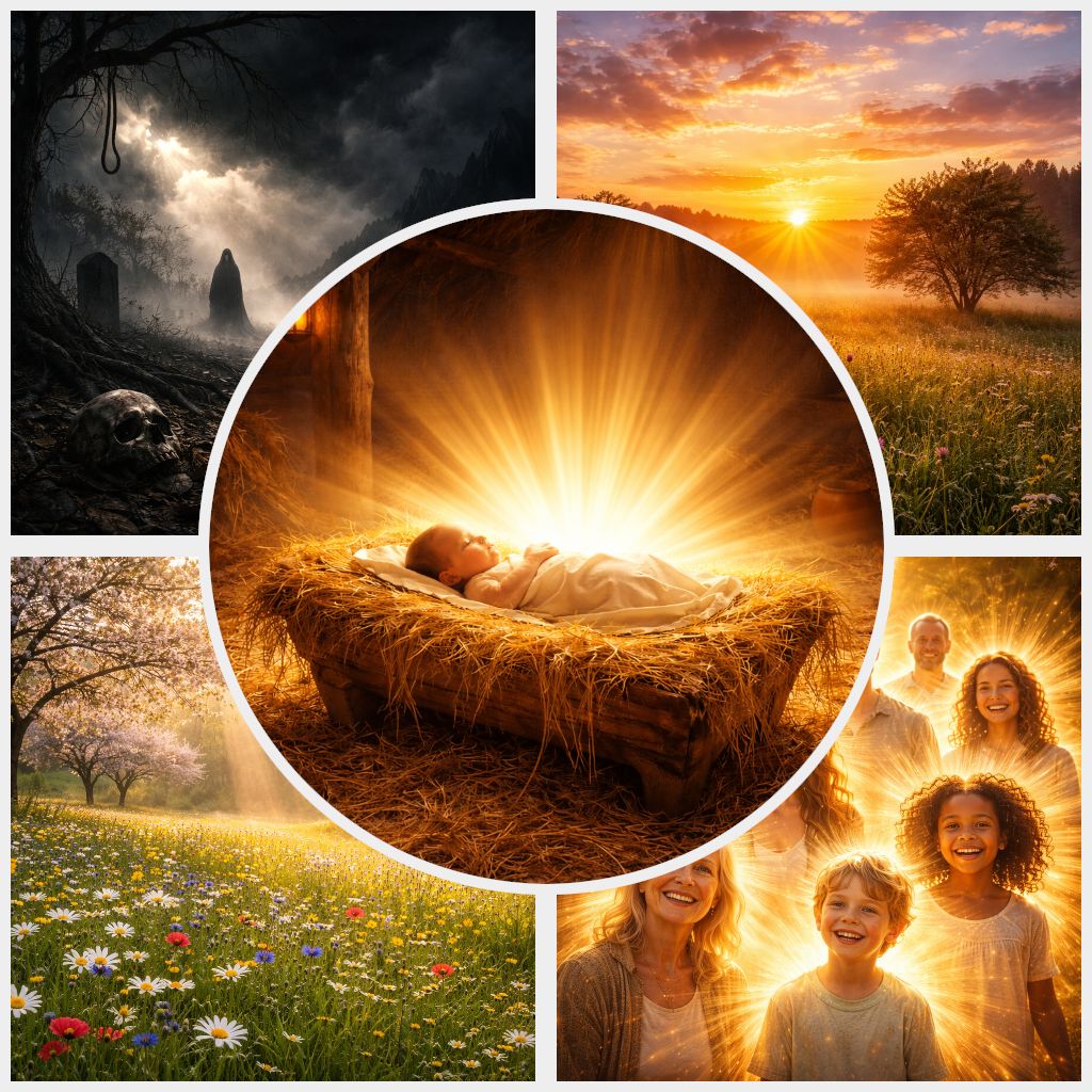 In der Mitte der Collage sehen wir kein Machtzeichen, keinen Thron, keine Demonstration von Stärke. Wir sehen ein Kind. Licht in Fülle strömt aus diesem Kind. Das Evangelium sagt: Christus, das wahre Licht, das jeden Menschen erleuchtet, kam in die Welt.