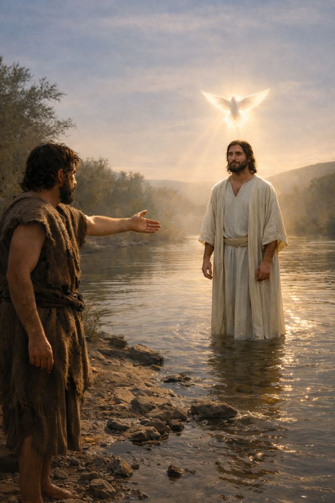 Am Ufer des Jordan steht Johannes der Täufer.
