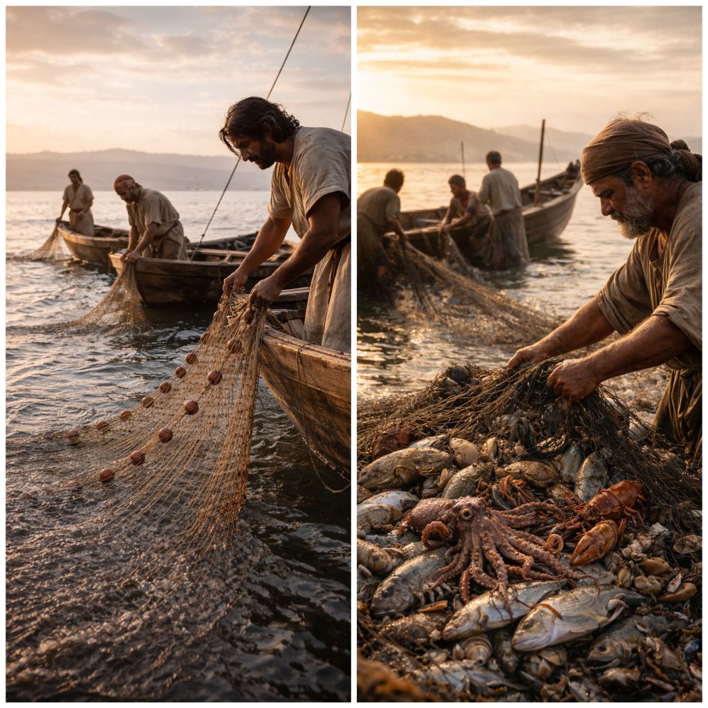Womit soll ich die Gottesherrschaft vergleichen? Fischer ließen ein Schleppnetz hinab in den See. Es brachte Fische jeder Art zusammen. Als es gefüllt war, zogen sie es ans Ufer und setzten sich hin, um die Fische zu sortieren. Die Reinen unter ihnen warfen sie in Körbe, die Unreinen warfen sie zurück in den See.