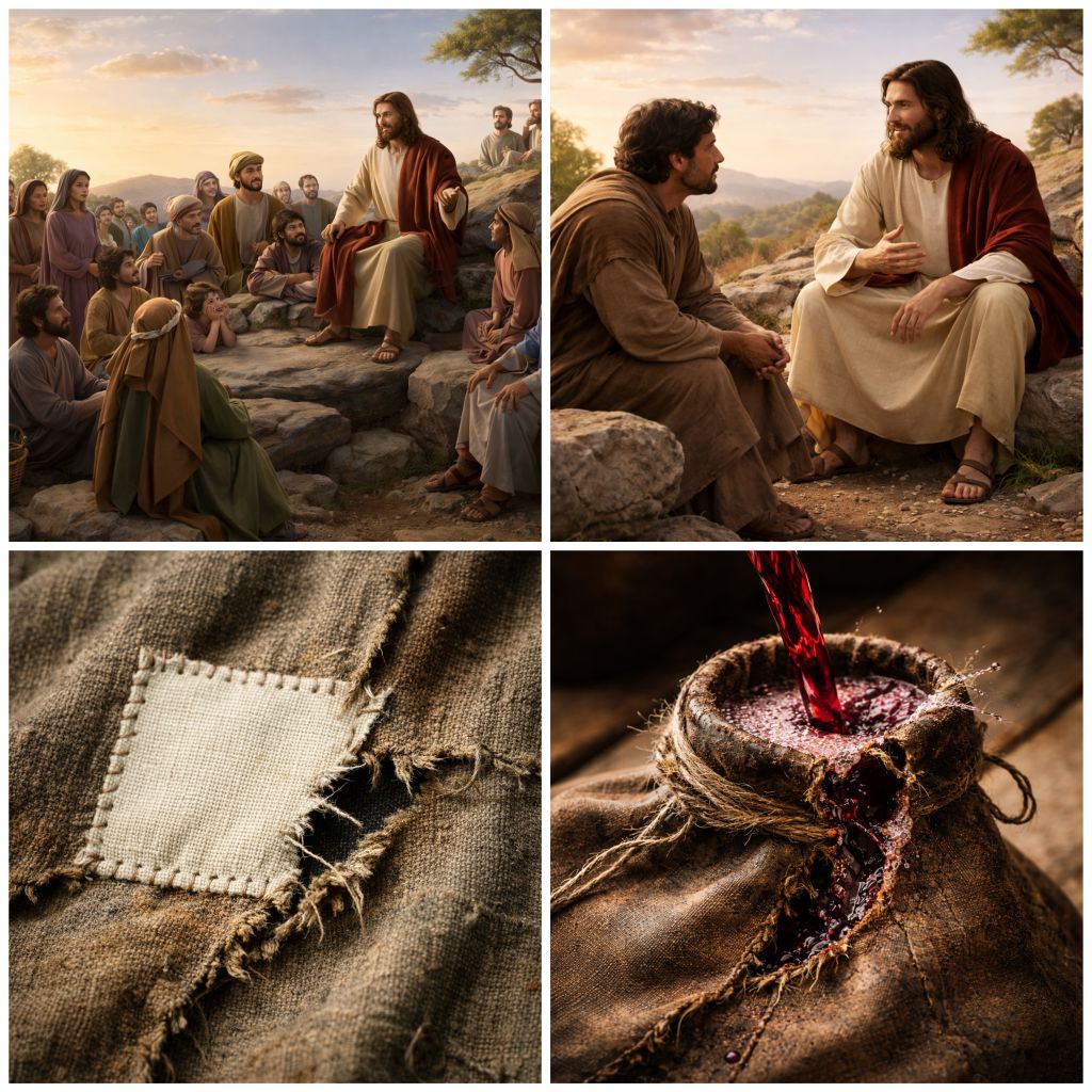 Jesus sah ihn an. Sein Blick war ruhig, nicht prüfend, eher einladend. 'Gut, dass du fragst, Thomas. Denn diese Worte sind nicht dazu da, dass man sie schnell abhakt. Stell dir ein altes Gewand vor. Es wurde oft getragen. Wenn nun ein Riss entsteht und jemand meint, er könne ihn mit einem neuen, ungewaschenen Flicken reparieren - was geschieht?' Thomas überlegte. 'Der neue Stoff zieht sich zusammen. Der Riss wird größer.' Jesus nickte.