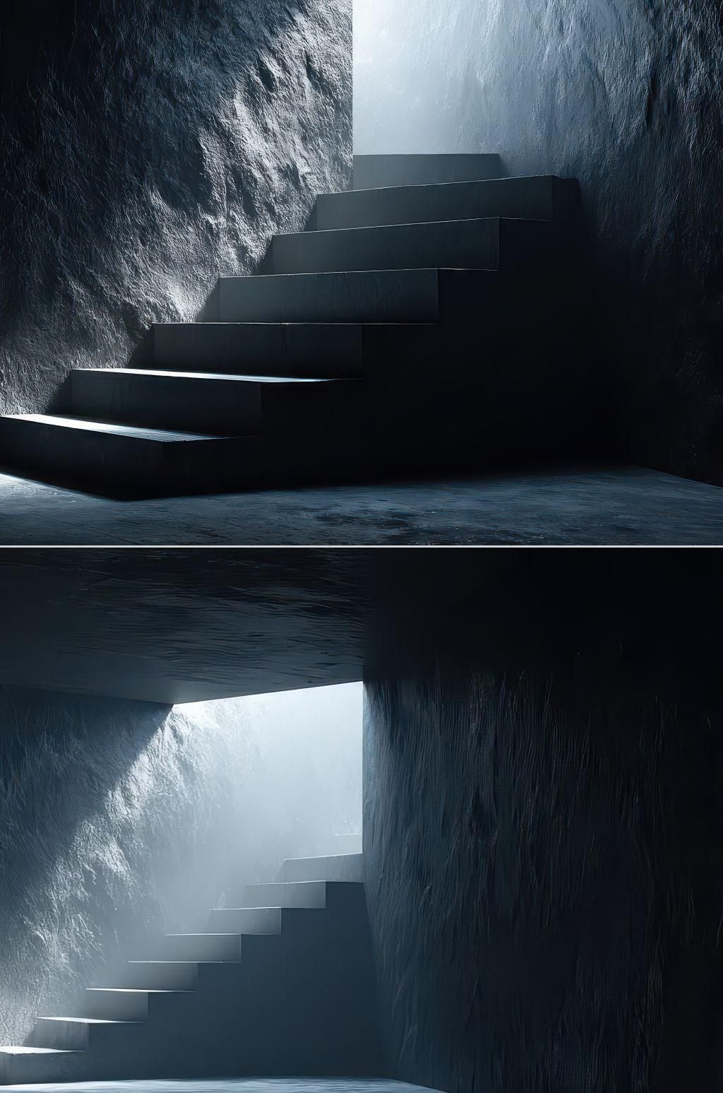 Das zweite Bild zeigt die Stiege, die aus der Tiefe nach oben führt. Das Licht fällt herein, klar und mächtig, und zieht nach oben.
