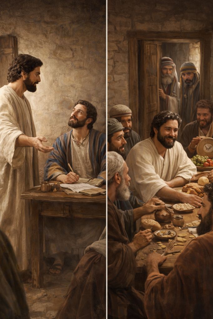 Als Jesus weiterging, sah er einen Mann namens Matthäus am Zoll sitzen und sagte zu ihm: Folge mir nach! Da stand Matthäus auf und folgte ihm. Und als Jesus in seinem Haus beim Essen war, kamen viele Zöllner und Sünder und aßen zusammen mit ihm und seinen Jüngern. Als die Pharisäer das sahen, sagten sie zu seinen Jüngern: Wie kann euer Meister zusammen mit Zöllnern und Sündern essen? Er hörte es und sagte: Nicht die Gesunden brauchen den Arzt, sondern die Kranken. Darum lernt, was es heißt: Barmherzigkeit will ich, nicht Opfer. Denn ich bin gekommen, um die Sünder zu rufen, nicht die Gerechten.