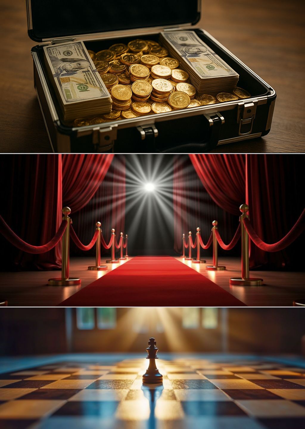 Vor uns ist eine Collage mit drei eindrucksvollen Bildern. Sie wirken wie ein Spiegel menschlicher Sehnsüchte: nach Reichtum, nach Anerkennung, nach Macht. Drei große Kräfte, die das Leben vieler bestimmen - und die doch alle brüchig sind.