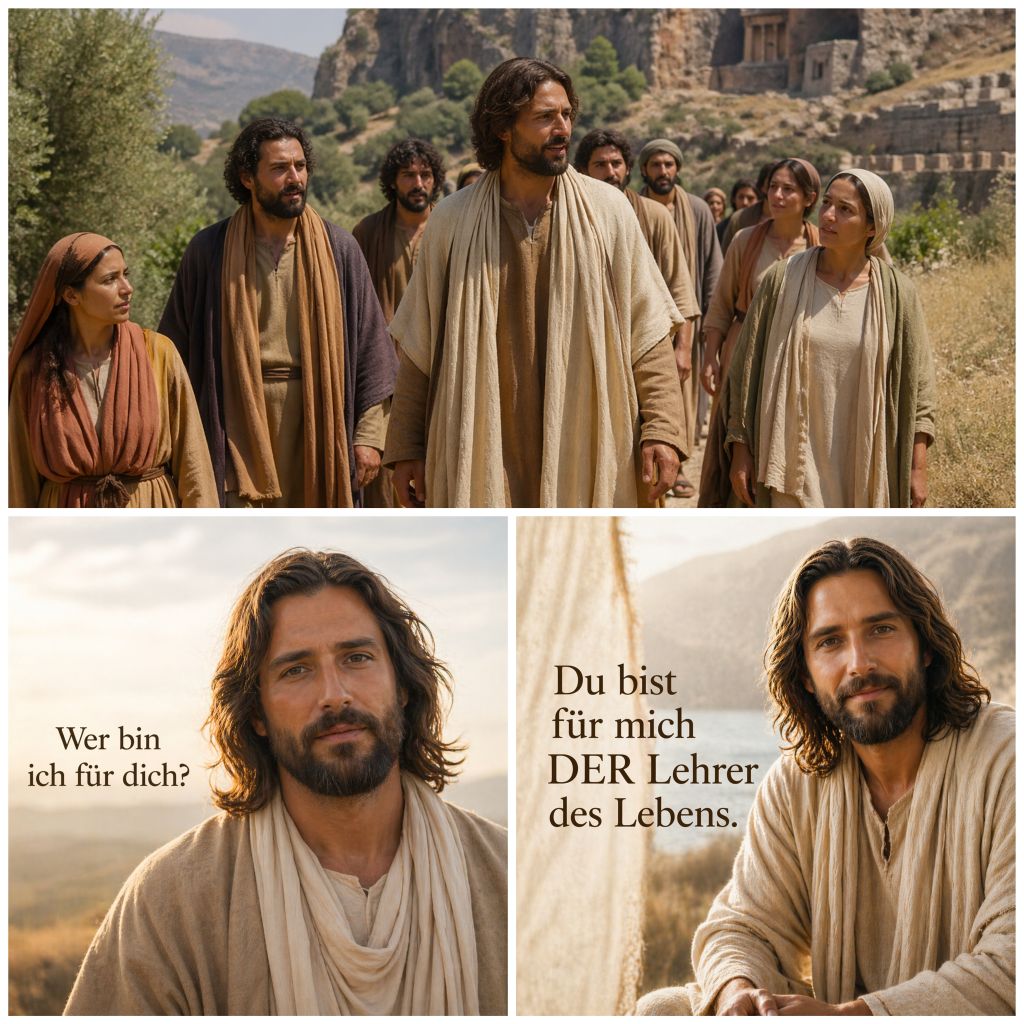 Dann wird es stiller. 'Ihr aber ...' Ein kleines Wort. Aber es verändert alles. 'Ihr aber - für wen haltet ihr mich?' Jetzt gibt es kein Ausweichen mehr. Keine Zitate. Keine fremden Stimmen. Jetzt geht es um das eigene Herz. Vielleicht schauen sie einander an. Vielleicht senken einige den Blick. Vielleicht spüren sie: Diese Frage ist größer als alles, was sie sagen können.